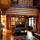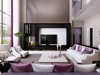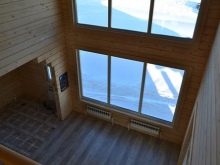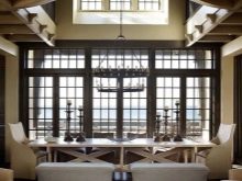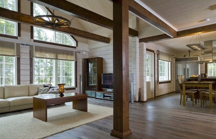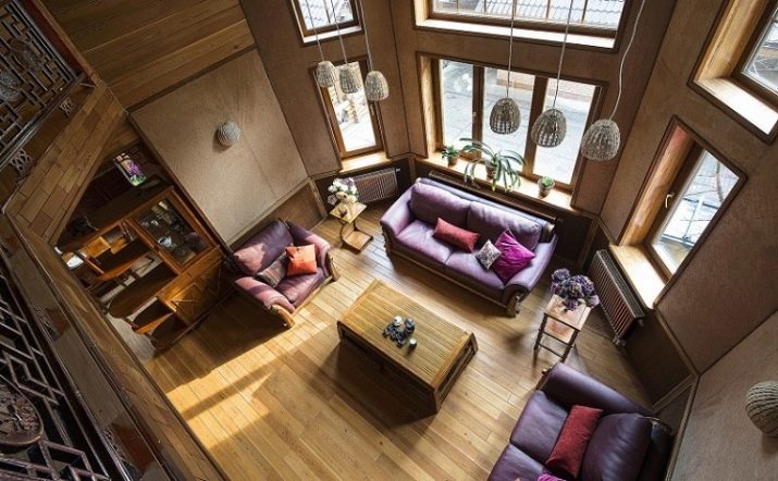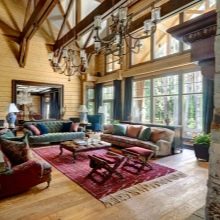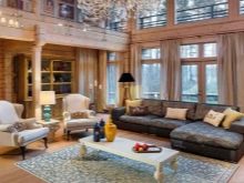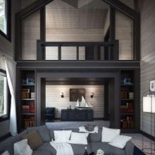 كما أن وجود الحزم لا يفسد مظهر غرفة المعيشة بطابقين.. توجد نوافذ المصباح الثاني في العلية السابقة ، تحت السقف ذاته. في بعض الأحيان ينتجون الزجاج المستمر العام من الأرضية إلى السطح.