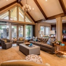 - تُظهر الصورة نظرة عامة داخلية على غرفة معيشة كبيرة لمنزل من طابق واحد.. الزجاج الواسع يغطي الجدران وجزء من السقف. المنظر الشامل يجعل من الممكن الشعور وكأنك في الغابة وفي نفس الوقت لا تفقد الشعور بالأمان.