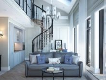 القاعة الخالية من التداخل تندفع للأعلى. يتم الجمع بين النوافذ البانورامية الكبيرة والزجاج العلوي ، مما يؤدي إلى حصول الغرفة المشتركة على “ضوء ثانٍ” إضافي. يمكنك الصعود إلى غرف النوم من خلال الخطوات المؤدية من الصالة أو غرفة المعيشة. يحاولون تزيين الدرج بأسلوب الغرفة بأكملها..