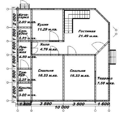 - يتم تقديم مخطط الطابق الأول من المنزل مع شرفة وضوء ثانٍ. حجم المبنى ، المجمع من بار ، هو 10×10 متر مربع. م.
