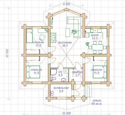 - مشروع كوخ خشبي مع نافذة كبيرة بمساحة إجمالية قدرها 98 مترًا مربعًا. م (13،100 × 12،300). توجد غرفة مرجل عند الباب الأمامي ، وهناك دهليز يمتد بين الردهة والقاعة ، مما يسمح لك بالتدفئة في غرفة كبيرة. تم الجمع بين غرفة المعيشة والمطبخ ، 5 أبواب لغرف النوم والغرف الفنية.