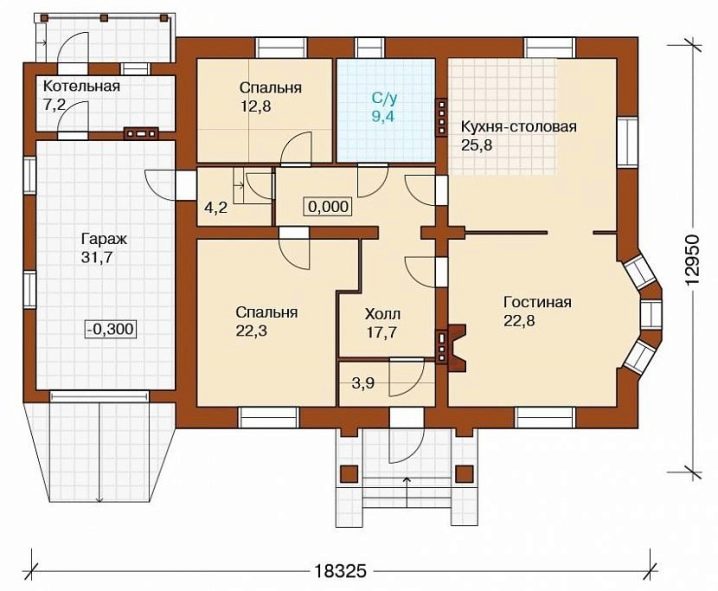 - قصة واحدة منزل حديقة بغرفتي نوم منفصلتين عن بعضهما البعض. يمكن فصل غرفة المعيشة الكبيرة ذات النوافذ البانورامية عن المطبخ بواسطة قسم ، وإذا رغبت في ذلك ، يمكن فصلها عن طريق طاولة بار. يمكنك دخول المرآب دون الخروج ، وهو مناسب جدًا في فصل الشتاء.