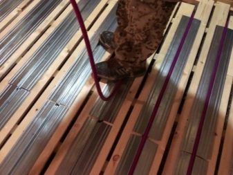 - يتم وضع الألواح (تفضيل الصنوبر أو الصنوبريات) ، حيث من الضروري ترك مساحة لخط الأنابيب. من الممكن أيضًا استخدام الخشب الرقائقي أو اللوح الليفي.