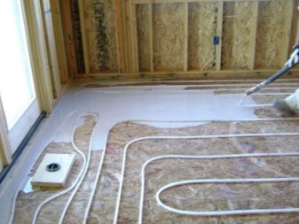 عند تثبيت النوع الثاني من عزل أرضية الإطار ، تتم العملية نفسها على هيكل خشن. يتمثل جوهر الطريقة في ترتيب الأرضيات للأنابيب ، مما يعني وجود واجهة عمل مختلفة..