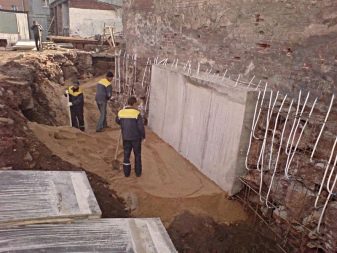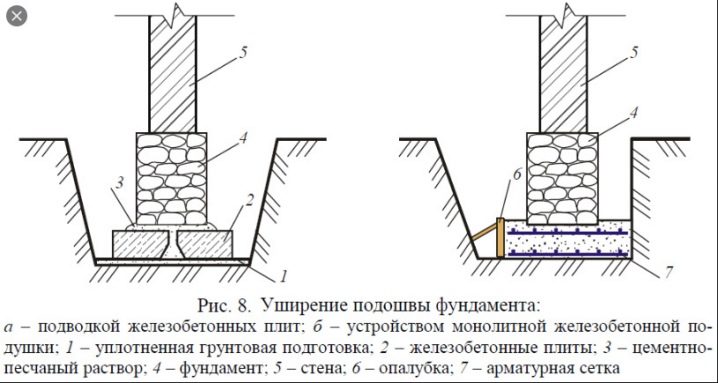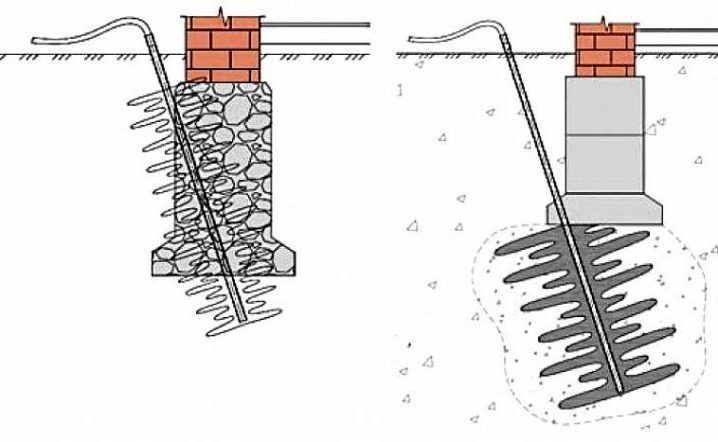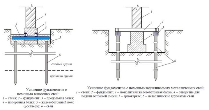 - تقوية الخوازيق. يتم حفر الآبار بالقرب من جدران قاعدة الأساس ، ويتم تقويتها وصبها بالخرسانة ، أو يتم تثبيت الأكوام الجاهزة.