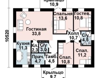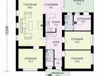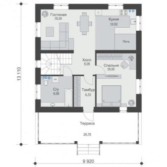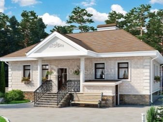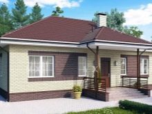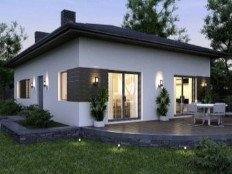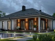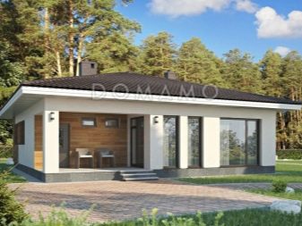 أكثر خيارات التصميم شيوعًا هو منزل من طابق واحد بمساحة تصل إلى 100 متر مربع. هذه المباني مناسبة للإقامة الدائمة ، ويمكن استكمالها بشرفة على أعمدة وأعمدة ، ولوجياس ، ونوافذ كبيرة. عادة ما يتم تضمين المباني التالية في تصميم منزل من طابق واحد: