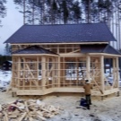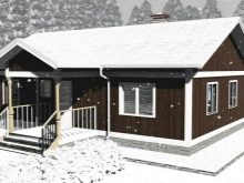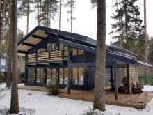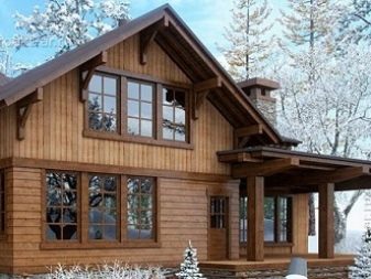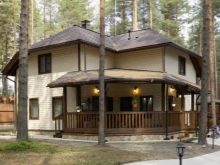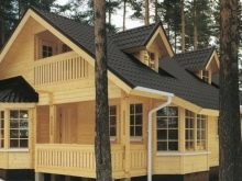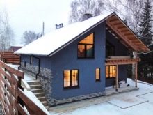 تم تلبيس المنزل بالخارج ، وتم الانتهاء من الطابق السفلي بالحجر ، والذي يمكن تغطيته بورنيش خاص للجمال. يسمح لك وزن المنزل بترتيب أساس كومة الشواية. سقف الجملون ونوافذ PVC.