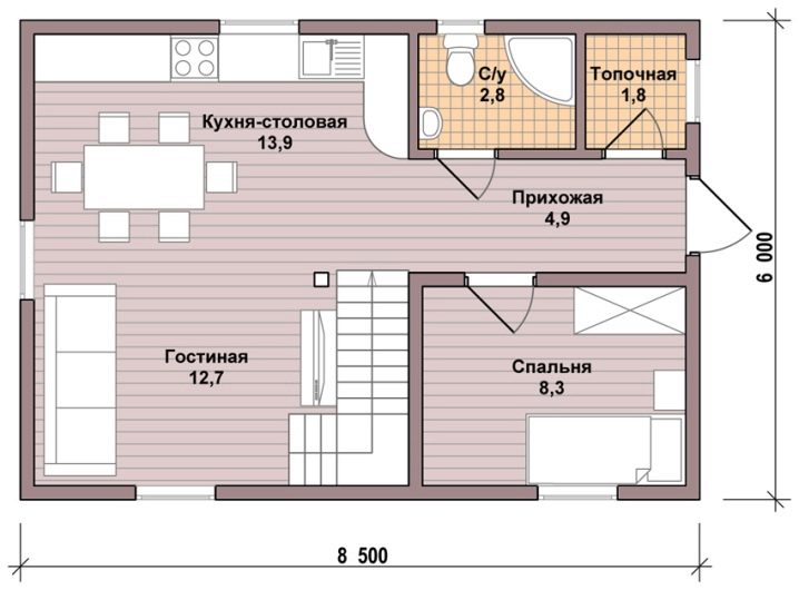 على سبيل المثال ، يحتوي المنزل الذي تبلغ أبعاده 13.5 × 9 م على جميع الغرف اللازمة: