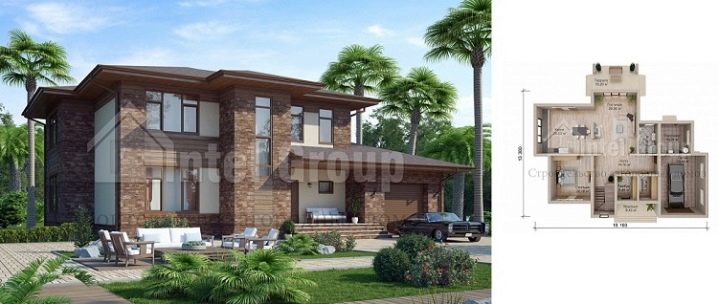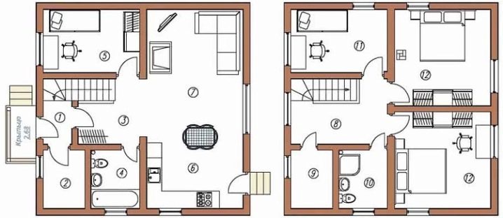 يوجد في الطابق الأرضي: صالة مدخل بها دهليز ، غرفة مرجل ، حمام ، غرفة نوم. من أجل عدم تقييد المساحة ، يمكن دمج المطبخ مع المخرج الثاني مع غرفة المعيشة ، مع إبراز منطقة تناول الطعام بصريًا. سيكون أيضًا بمثابة الحدود بين مناطق الطهي والاستجمام. وهكذا يتحقق تأثير الحرية ، لأن نصف الأرضية ليس به حواجز. في الطابق الثاني ، يمكنك وضع ثلاث غرف وحمام وغرفة ملابس وقاعة في منطقة الدرج.