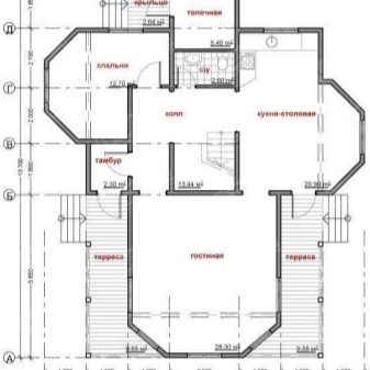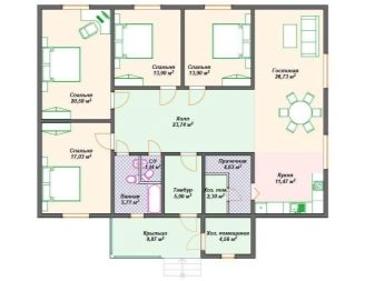 من المفيد الآن التفكير في ماهية المنازل نفسها من شريط مزدوج. يشتمل أحد خيارات المباني المكونة من طابق واحد على شرفة بطول 14 مترًا. تبلغ مساحة المعيشة في هذا المشروع أقل بقليل من 28 مترًا مربعًا. م. Tambour بمساحة 4.25 متر مربع. م أكثر من العديد من التصاميم الأخرى. توجد غرفتان للمعيشة تبلغ مساحتها حوالي 8 م 2.