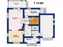 في أحد الخيارات ، يبدأ بمساحة 15.7 قدم مربع. م. من هناك يمكنك الدخول إلى غرفة المعيشة التي يبلغ ارتفاعها 24 مترًا ثم الدخول إلى القاعة التي يبلغ ارتفاعها 10 أمتار. الجدير بالذكر أنه لا يمكنك الوصول إلى الغرفة المجاورة لغرفة المعيشة إلا من خلال الرواق. كما تم تخصيص مطبخ وحمام في الطابق الأول..