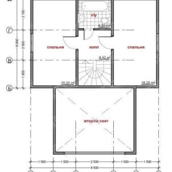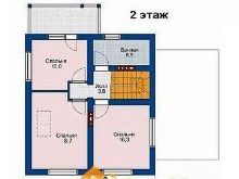 البديل ينطوي على ترتيب مسكن بشكل أكثر تعقيدًا.. على جانب واحد يوجد رواق منفصل يؤدي إلى الفرن بمساحة 5.4 متر مربع. م مجهزة بمساحة كبيرة جدا – 28.3 متر مربع. م – غرفة المعيشة. يتم عرض المدرجات من نفس الشكل والمساحة على جانبيها.