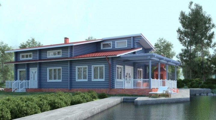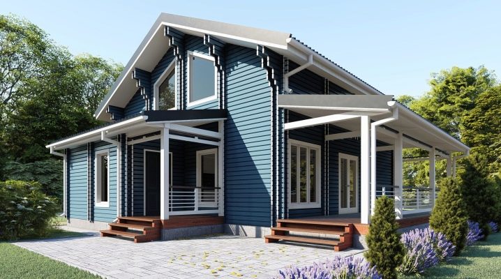 يمكن طلاء المنزل الخشبي المزدوج باللون الأزرق الجذاب. في هذه الحالة ، فإن السقف المصنوع من البلاط المعدني الأحمر مقبول تمامًا. تسمح لك معدات الشرفة الأنيقة بالاستمتاع بالراحة وروعة المناظر المحيطة. استخدام الشرفة الإضافية يعني زيادة استقلالية السكان عن بعضهم البعض.