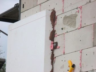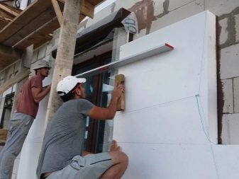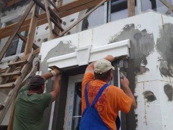 للتثبيت ، يمكنك استخدام الرغوة أو الغراء. إذا كنت تقوم بتثبيت ألواح الستايروفوم ، فيمكنك استخدام المسامير البلاستيكية. في المرحلة النهائية ، يتم تنفيذ التشطيب الزخرفي – فتيلة وشبكة من الألياف الزجاجية وطبقة من غراء التعزيز والجص.