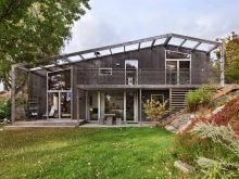 - منزل واسع, حيث في دور الزخرفة الطبيعية – تقليم خشبي ، بخطوط بسيطة وصارمة ، أفاريز وألواح خشبية من نفس اللون ، أو مع تقليم من الطوب ، وبالتأكيد مع نوافذ مكبرة ، بحيث يكون هناك وفرة من الضوء في الداخل.