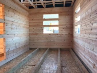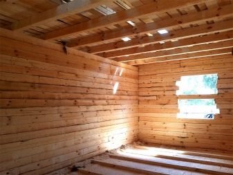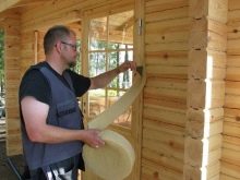فتحات النوافذ والأبواب مزودة بمسامير لضمان عدم تشويه الجدار. تم تجهيز المساحات الكبيرة بممرات شريط كامل. لا يمكنك قطعه إلا بعد تقلص المنازل ، ولكن فقط قبل تثبيت الأبواب والنوافذ. بمجرد تجميع جدران منزل السجل ، يتم تثبيت عوارض الأرضية وتثبيتها في الأعلى. عادة ما يتم إنشاء العوارض الخشبية وإطارات الجملونات من ألواح بحجم 5 × 20 أو 5 × 15 سم ، ويُسمح بانحياز أو لوح ذو حواف مقاس 2.5 × 15 سم على غلاف الجملون.