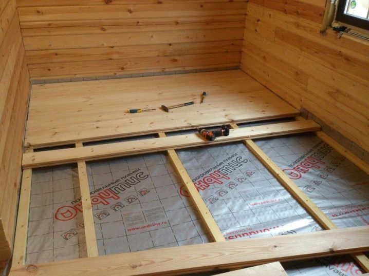 لفترة تجميع منزل السجل ، من الضروري ترتيب أرضية مؤقتة على طول السجلات. فقط في المرحلة النهائية يحين الوقت لتركيب الأرضية الخشنة والنهائية..