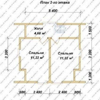 في الطبقة العليا ، ستجذب الانتباه قاعة بحجم 4.6 مربعات. إنه كافٍ للصعود والنزول الأمثل للسلالم. باقي الطابق مخصص لزوج من غرف النوم. مساحتها هي نفسها 11.22 متر مربع. م.