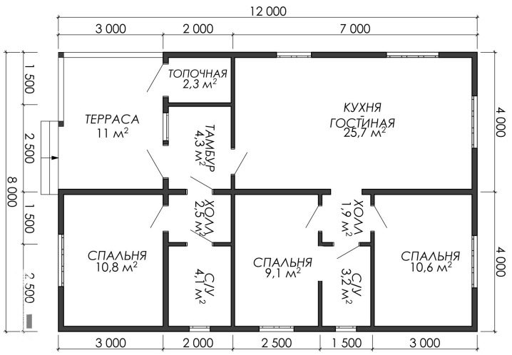 في نسخة بديلة من منزل من طابق واحد ، تهيمن منطقة المعيشة في المطبخ. تبلغ مساحتها 25.7 مترًا مربعًا. م ، وهو ما يكفي لحل معظم المهام اليومية. يوجد أيضًا 3 غرف نوم مختلفة قليلاً في الحجم. بالإضافة إلى ذلك ، يوجد مكان لـ: