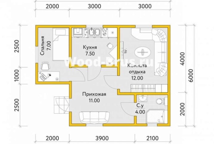 مفهوم آخر ينطوي على استخدام غرفة نوم واحدة فقط بمساحة 7 أمتار مربعة. م. ولكن يتم تخصيص ما يصل إلى 12 مترًا مربعًا لغرفة الترفيه. م يتم توفير غرفة بمساحة 11 متر لاستقبال الضيوف. يمكنك طهي الطعام في مطبخ واسع نسبيًا. حجم الحمام مريح أيضًا.