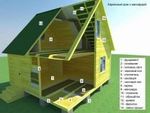 منزل بإطار بمساحة 135 مترًا مربعًا. م مع العلية وشرفة وشرفة كبيرة. يبلغ طول المبنى 11.8 مترًا وعرضه 8.85 مترًا ، ويحتوي المنزل على مدخلين: على جانب واحد يكمل باب المدخل رواق ومظلة ، وعلى الجانب الآخر يقع المدخل على الشرفة.