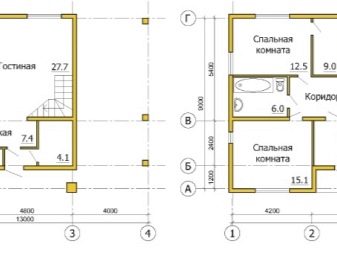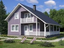 كوخ خشبي من طابقين بمساحة إجمالية 135 مترًا مربعًا. م. مواد التسقيف – معدنية. يقع المرآب على يسار المدخل الرئيسي للمنزل. يشغل الطابق الأول قاعة بها نافذة كبيرة ومطبخ مدمج مع غرفة طعام وحمام مع مرحاض. من القاعة الكبيرة ، تؤدي أبواب المدخل إلى جميع مناطق المعيشة والتقنية ، بالإضافة إلى درج مميز يؤدي إلى الطابق الثاني. يوجد في الطابق الثاني 3 غرف نوم مع غرف ملابس وحمام مشترك.