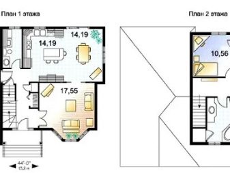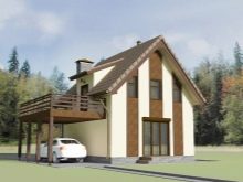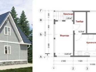 في مشروع كوخ صغير مع أرضية علية ، يشار إلى مدخل المنزل من جانب الشرفة الأرضية. يوجد في الطابق الأول غرفة ومطبخ مدمجين مع غرفة طعام ، وفي الطابق الثاني يوجد غرفتين نوم وقاعة كبيرة. تغطي الشرفة الأرضية الضخمة مساحة 4.75×2.5 متر وهي إضافة جيدة لمبنى مدمج.