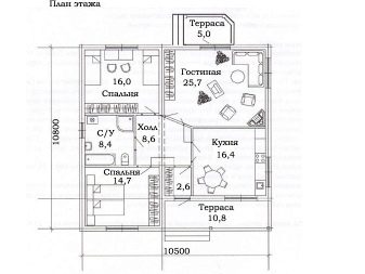 مشروع منزل من طابقين بمساحة 10×8 م يتضمن غرفة مرجل مستقلة. يقع في الطابق الأرضي على يسار الدهليز بجوار الحمام. يوجد في الجزء السفلي من المبنى صالة كبيرة وغرفة نوم وغرفة معيشة ومطبخ. الطابق الثاني يحتوي على ثلاث غرف نوم وحمام ، متحده بصالة شاملة.
