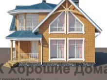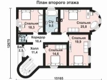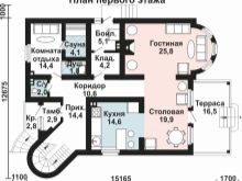 نوع آخر من المشروع يشمل تقسيم منطقة الحمام إلى ساونا وغرفة دش. بالإضافة إلى ذلك ، تم تجهيز غرفة ترفيهية في الزاوية تبلغ مساحتها حوالي 14 مترًا مربعًا. يتم توفير الاتصال بين الغرف المختلفة من خلال ممر. في الطابق الأرضي ، تم وضع غرفة طعام وغرفة معيشة (20 و 25.8 متر مربع) دون فصل واضح. سيكون الطهي في مطبخ بمساحة 14.6 مترًا مربعًا أمرًا سهلاً وممتعًا.
