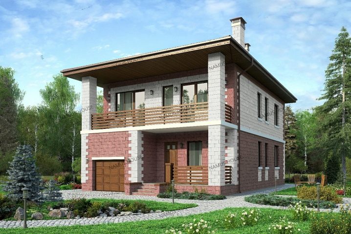 قد يكون لمنزل الكتلة سقف مسطح بسيط يناسب استخدامه على أفضل وجه. في هذه الحالة ، يوصى أيضًا بترتيب أعمدة عند مدخل المنزل ، بالإضافة إلى شرفة ومغطاة مرتجلة. تبين أن مظهر المبنى ممتع للغاية بسبب الاستخدام الماهر للعناصر الخشبية أو الخشبية. تم تزيين جدران الواجهة بمزيج من الأبيض والوردي الفاتح.