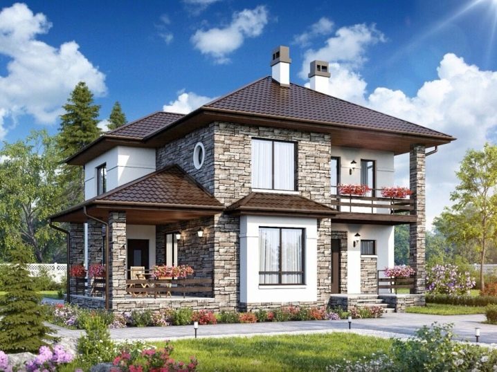 يمكن بناء منزل مسطح بسيط بجدران ناعمة من الكتل.. تُظهر الصورة مثل هذا الخيار – كل آثار “الأصل الخاص” مغطاة بزخرفة. يعد التوافق البصري للسقف على السطح الرئيسي وعلى الشرفين حافزًا جماليًا إضافيًا. يختلف الطابق السفلي عن الجزء الرئيسي من الجدران ، وهذا الظرف يجعل المنزل أكثر تشويقًا. كما في الحالات السابقة ، يتم الجمع بين المنطقة المحيطة بالمنزل بشكل متناغم تمامًا..