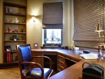حل مثير للاهتمام هو ترتيب منطقة العمل. لهذا ، يتم تثبيت سطح الطاولة تحت الزجاج. يتم تثبيت هياكل الأرفف أو أرفف الكتب والأشياء الأخرى على الجانبين. يتم وضع الكراسي تحت سطح الطاولة.