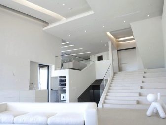 في المنازل الجميلة المكونة من طابقين ، ينظمون بهذه الطريقة منطقة غرفة معيشة مع درج رئيسي يؤدي إلى الجزء العلوي من المنزل.. يجب أن تكون غرفة المعيشة لتطبيق الضوء الثاني واسعة ، أكبر من 100 متر مربع.