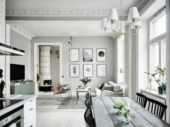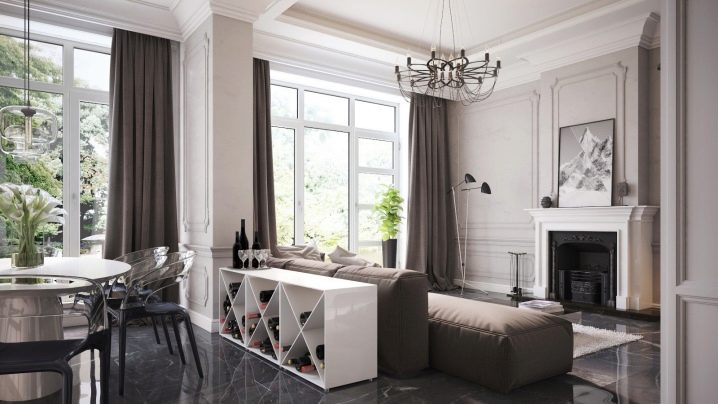 التصميمات الداخلية العصرية للمنازل هي أولاً وقبل كل شيء خطة مفتوحة. ظاهريًا ، يبدو كالتالي: بعض الغرف مدمجة ومقسمة إلى مناطق عن طريق التأثيث والديكور. على سبيل المثال, المطبخ متصل بغرفة الطعام وغرفة المعيشة ، أو غرفة النوم وخزانة الملابس والحمام مدمجة في مجمع واحد.