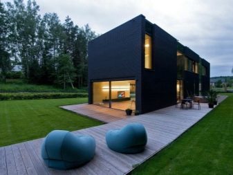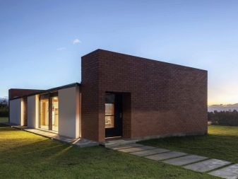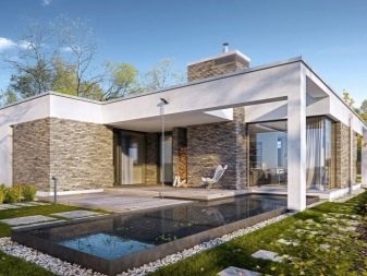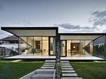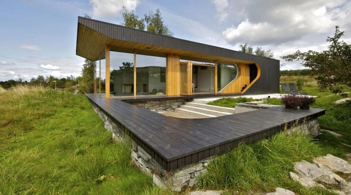 تتمتع المنازل التعبيرية المكونة من طابق واحد بالقدرة على الحصول على زجاج بانورامي ، والذي يبدو دائمًا مفيدًا ويحسن إضاءة الغرف. بحجم صغير جدًا ، لا يمكنك الخوف من الازدحام وترتيب المجالات الوظيفية بنجاح: النوافذ الكبيرة والمباني الملحقة والمدرجات المغطاة ستأتي للإنقاذ. خيار جيد لخبراء الهواء النقي هو تجهيز شرفة فسيحة بمنطقة جلوس على طول محيط المنزل. سوف يحميك السقف المتدلي من سوء الأحوال الجوية.