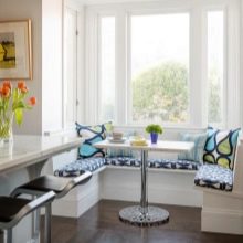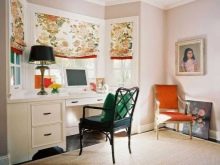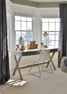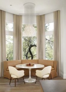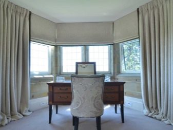 - إذا تم تثبيت طاولات دائرية مع قواعد في نافذة الخليج لإنشاء منطقة عمل ، يتم اختيار المنسوجات قصيرة وعملية ، والتي لا تتناسب مع سطح الطاولة ، ويمكن إزالتها بسهولة من النوافذ وغسلها. في مثل هذه الحالات ، غالبًا ما تستخدم الستائر الدوارة أو الستائر الرومانية. يتطلب الأثاث المنجد نصف القطر المثبت على طول خط الجدران المنحنية نفس زخرفة النافذة كما هو الحال مع خزانة مع سطح عمل.
