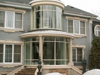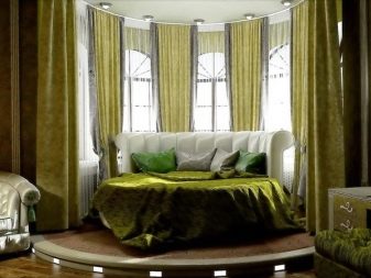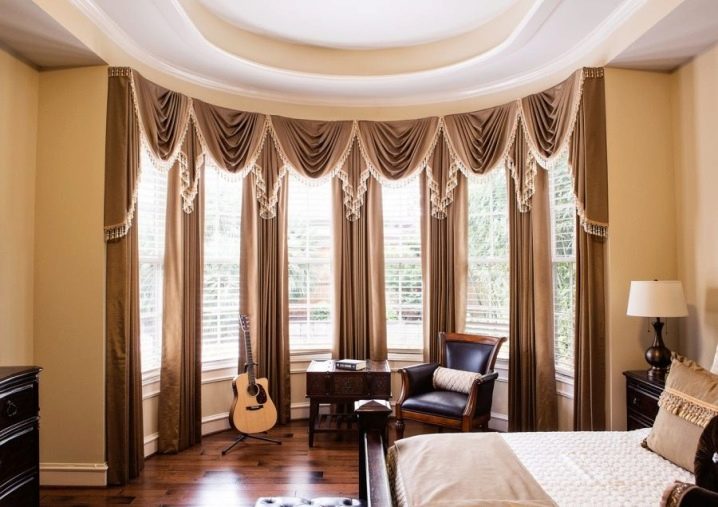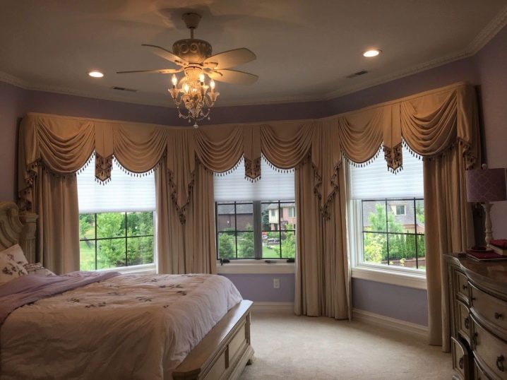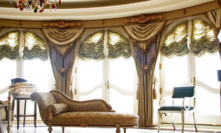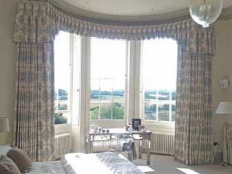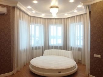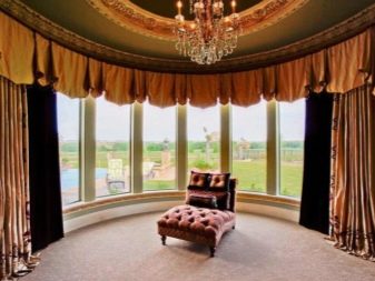 - مستدير. نسخة جميلة من الحافة ذات الأشكال الناعمة ، وممتعة جمالياً من الداخل والخارج. على عكس متعدد السطوح ، ليس من الصعب تصميم مثل هذه النوافذ ، يكفي استخدام إفريز منحني – ولا تحتاج إلى تقسيمه إلى عناصر ، والستائر إلى لوحات صغيرة مستقلة.