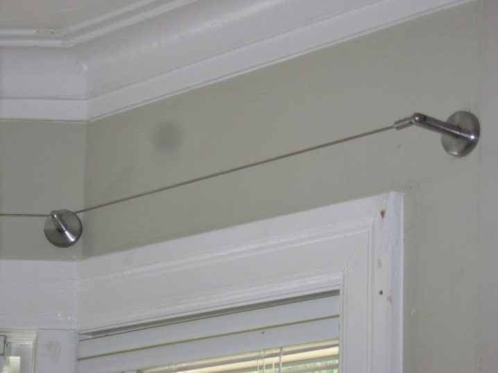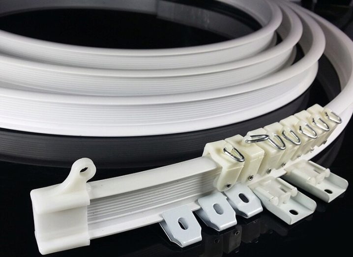قضبان الستائر الدائرية مثبتة على الجدران ، فهي متينة للغاية ، ويمكنها بسهولة تحمل الستائر الثقيلة. تبدو المنتجات زخرفية ولا تحتاج إلى تثبيت مخفي.