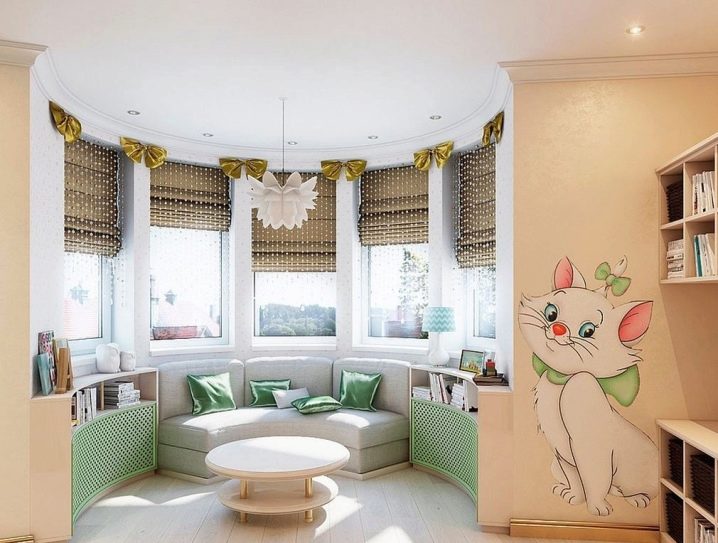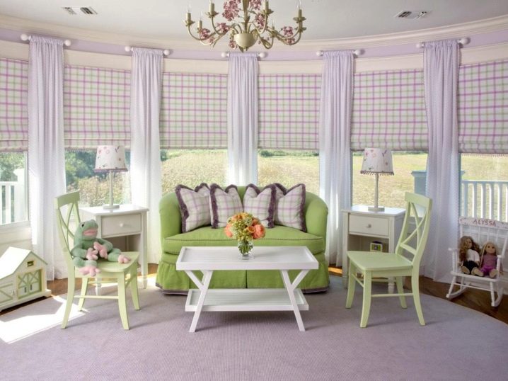 لا توجد قيود في غرفة الأطفال على أنواع الستائر ، وأي خيارات مقبولة لها – من الستائر الكلاسيكية إلى اللوحات القماشية الملفوفة.. الشيء الرئيسي هو أنها ليست صارمة ومملة..