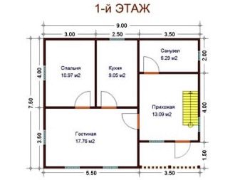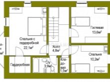 يمكنك استخدام حل آخر.. في هذا الإصدار ، ستهيمن غرفة الضيوف على الطابق السفلي ، والتي تبلغ ضعف حجم المطبخ تقريبًا. في الحمام الذي يبلغ طوله 6 أمتار ، سيشعر السكان بالراحة الكافية.