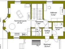 يتضمن الخيار الآخر ترتيب غرفة معيشة مطبخ بطول 27 مترًا. تبلغ مساحة الشرفة 22 مترًا مربعًا. م على الرغم من أن الحمام في الطابق السفلي صغير (3 أمتار مربعة فقط) ، إلا أنه يؤدي وظيفته بانتظام. يوجد في الطابق العلوي غرفة نوم مع خزانة ملابس.