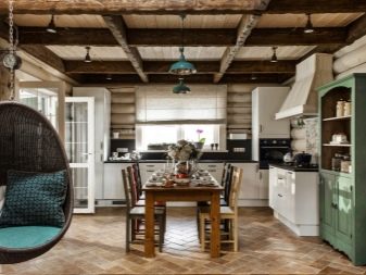 تستخدم أرضيات الباركيه إذا كان المنزل مزينًا بأسلوب أنيق. في بعض الحالات ، تتم ممارسة تزيين الأرضية بالبلاط الذي يقلد مظهر الخشب. خشب الفلين ممتع للأقدام ويخفف الضوضاء المختلفة. عادة ما تترك الحزم المفتوحة على الأسقف. يمكن أن يحتوي الجزء العلوي من أي غرفة على ظلال غنية ، داكنة ، سوداء تقريبًا..