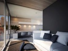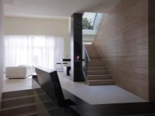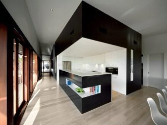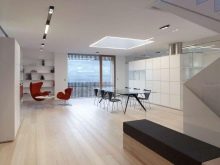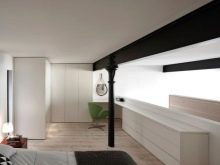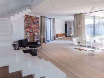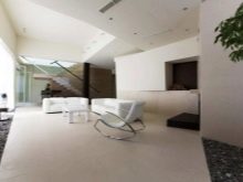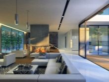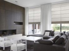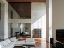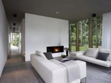 غالبًا ما يتم تقسيم المناطق باستخدام أرضيات وأسقف متعددة المستويات. عادة ما يتم تعليق الستائر الرومانية على النوافذ. ولكن يمكنك الحصول على أبسط منسوجات النوافذ. لكن اللمبريكين والستائر المعقدة الأخرى غير مرغوب فيها. تستخدم غرف النوم أنظمة التخزين ، وتحتوي الحمامات على أحواض استحمام أنيقة باللونين الأسود والأبيض..