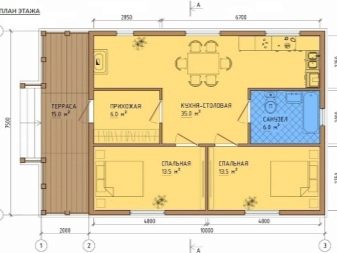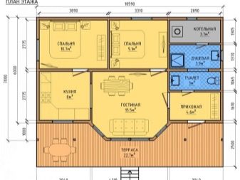 منطقة العمل فيه ممتدة في خط. يتضمن الخيار الأكثر تعقيدًا ترتيب شرفة ذات شكل هندسي معقد بمساحة 22.7 مترًا مربعًا. م. يجد الأشخاص الذين يدخلون المنزل أنفسهم أولاً في غرفة ضيوف مساحتها 15 مترًا. على يساره المطبخ. على اليمين يوجد مدخل ودش ومرحاض. الغرف الأبعد عن المدخل هي غرفة المرجل وغرفتي نوم.