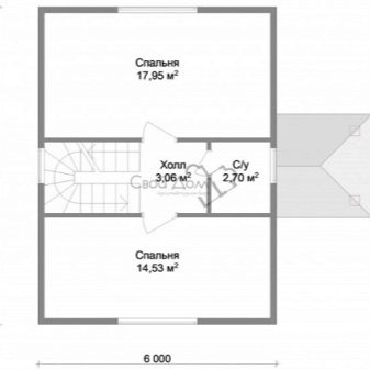خيار آخر يتضمن ترتيب مدخل 4.5 “مربع”. من هناك يمكنك الوصول إلى الممر الذي ينتهي جانبه الأيمن بحمام. يحتوي الطابق الأول أيضًا على غرفة نوم ومطبخ. تم تسليم الطابق الثاني بالكامل إلى منطقة النوم.