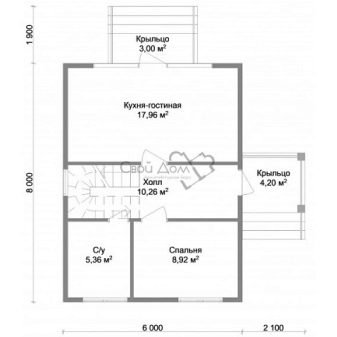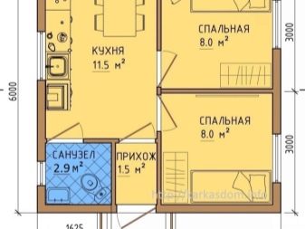 إذا كان حجم المنزل 6 × 6 أمتار ، فيمكنك استخدام مفهوم مختلف. على جانب واحد من الدهليز يوجد حمام ، وعلى الجانب الآخر – إحدى غرف النوم بمساحة 8 أمتار مربعة. م تقع غرفة النوم ذات الحجم نفسه في الزاوية اليمنى القصوى (كما تُرى من المدخل). مساحة المطبخ 11.5 “مربعات”.