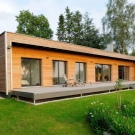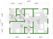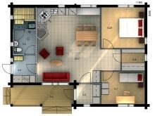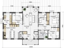 منطقة العمل فيه ممتدة في خط. يتضمن الخيار الأكثر تعقيدًا ترتيب شرفة ذات شكل هندسي معقد بمساحة 22.7 مترًا مربعًا. م. يجد الأشخاص الذين يدخلون المنزل أنفسهم أولاً في غرفة ضيوف مساحتها 15 مترًا. على يساره المطبخ. على اليمين يوجد مدخل ودش ومرحاض. الغرف الأبعد عن المدخل هي غرفة المرجل وغرفتي نوم.