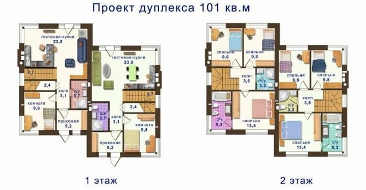 يتم وضع تصميمات الدوبلكس وفقًا لنفس المعايير الأساسية مثل الأكواخ. من بين مجموعة متنوعة من الحلول المعمارية والتخطيطية ، سيتمكن صاحب المنزل من اختيار ما هو أكثر ملاءمة له. في أي حال ، سيكون لهذه المنازل ميزاتها المميزة..