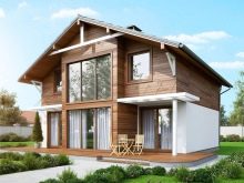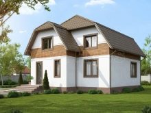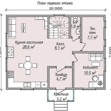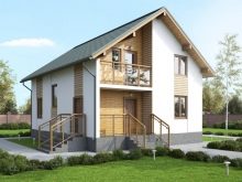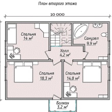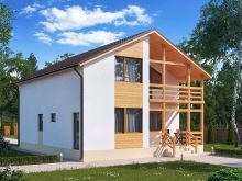 الخيار 2. منزل من طابقين مصنوع من ألواح SIP ، بقياس 10×7.5 متر مربع. م ، مع شرفة وشرفة. يحتوي مخطط الطابقين على قاعات مركزية بمداخل منفصلة لكل غرفة. يوجد في الطابق الأول غرفة معيشة مع مطبخ ومكتب وحمام وغرفة تقنية. يوجد في الجزء العلوي من المنزل الريفي 3 غرف نوم وحمام كبير.