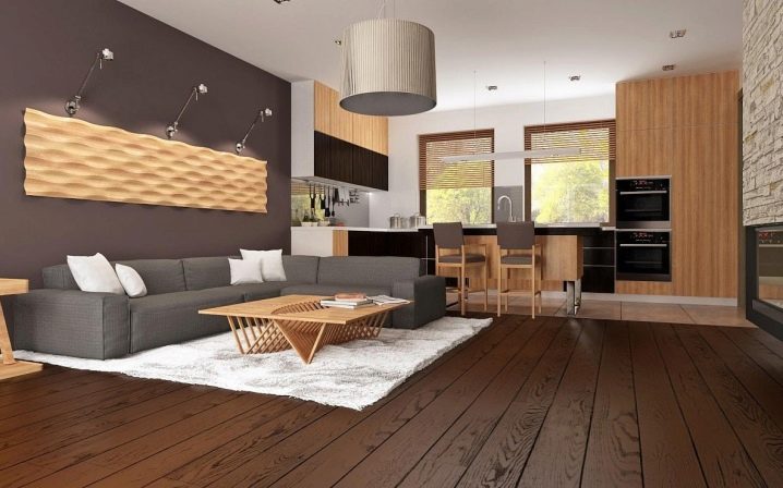 عند الجمع بين المطبخ وغرفة المعيشة في غرفة واحدة ، تتميز المناطق بالتباين البصري.. اللوحات والنسخ البسيطة والصور بالأبيض والأسود مناسبة للديكور. لكن لا ينبغي أن تكون المساحة مفرطة في التشبع بها والتحف الأخرى. من المستحسن الحفاظ على الداخل بألوان طبيعية. ومن بينها ، بدورها ، سيكون لون الخشب الطبيعي هو القائد بلا منازع..